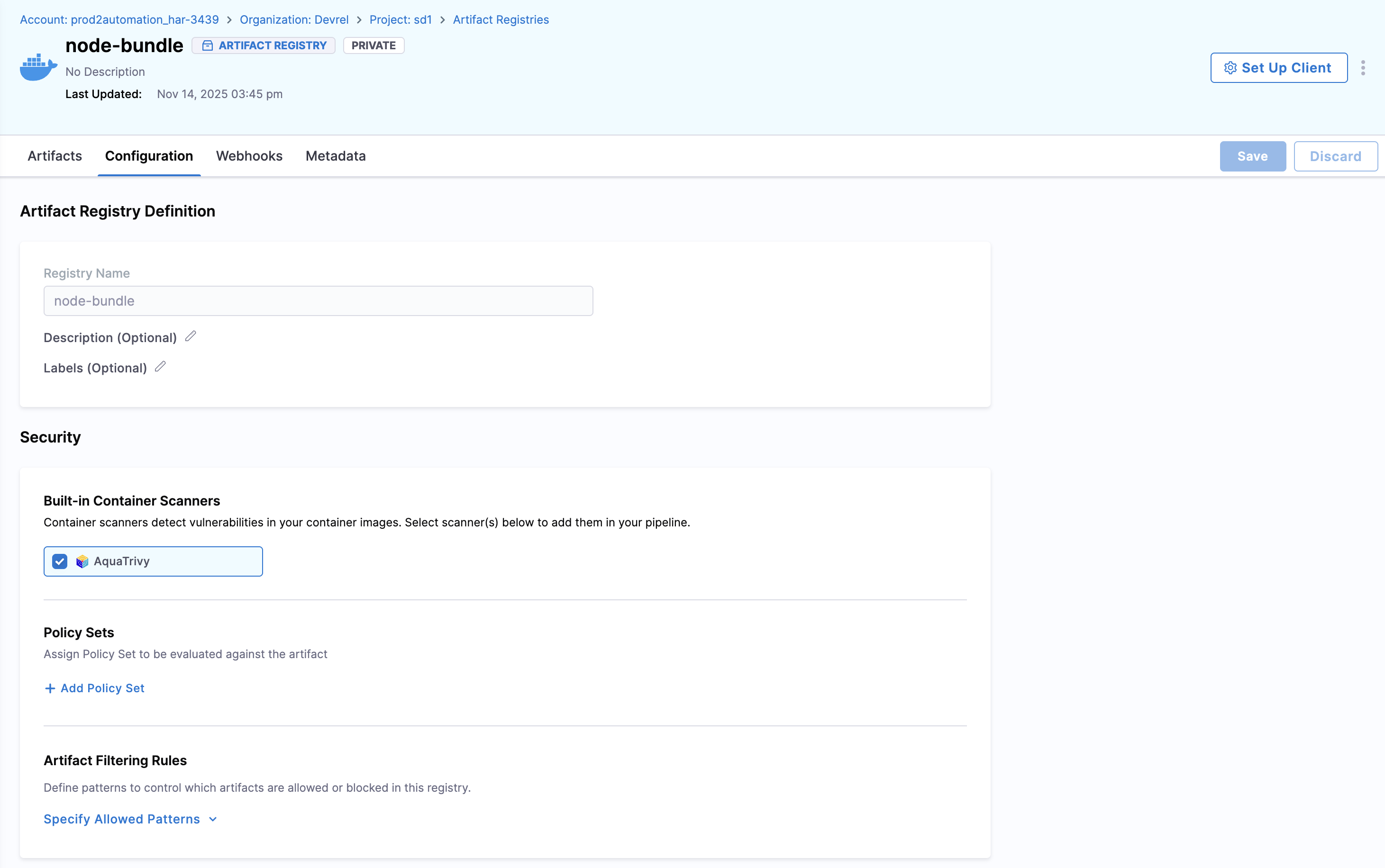In Allowed Patterns, use a regex string to define which artifacts will be allowed into the registry. The regex will match against each incoming artifact and, if the match is successful, allow the push operation.