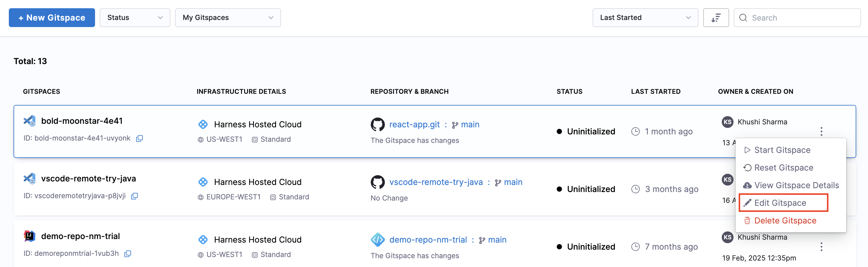 - Gitspace Dashboard: Click on the "three dots" menu of your Gitspace and click on Edit Gitspace.