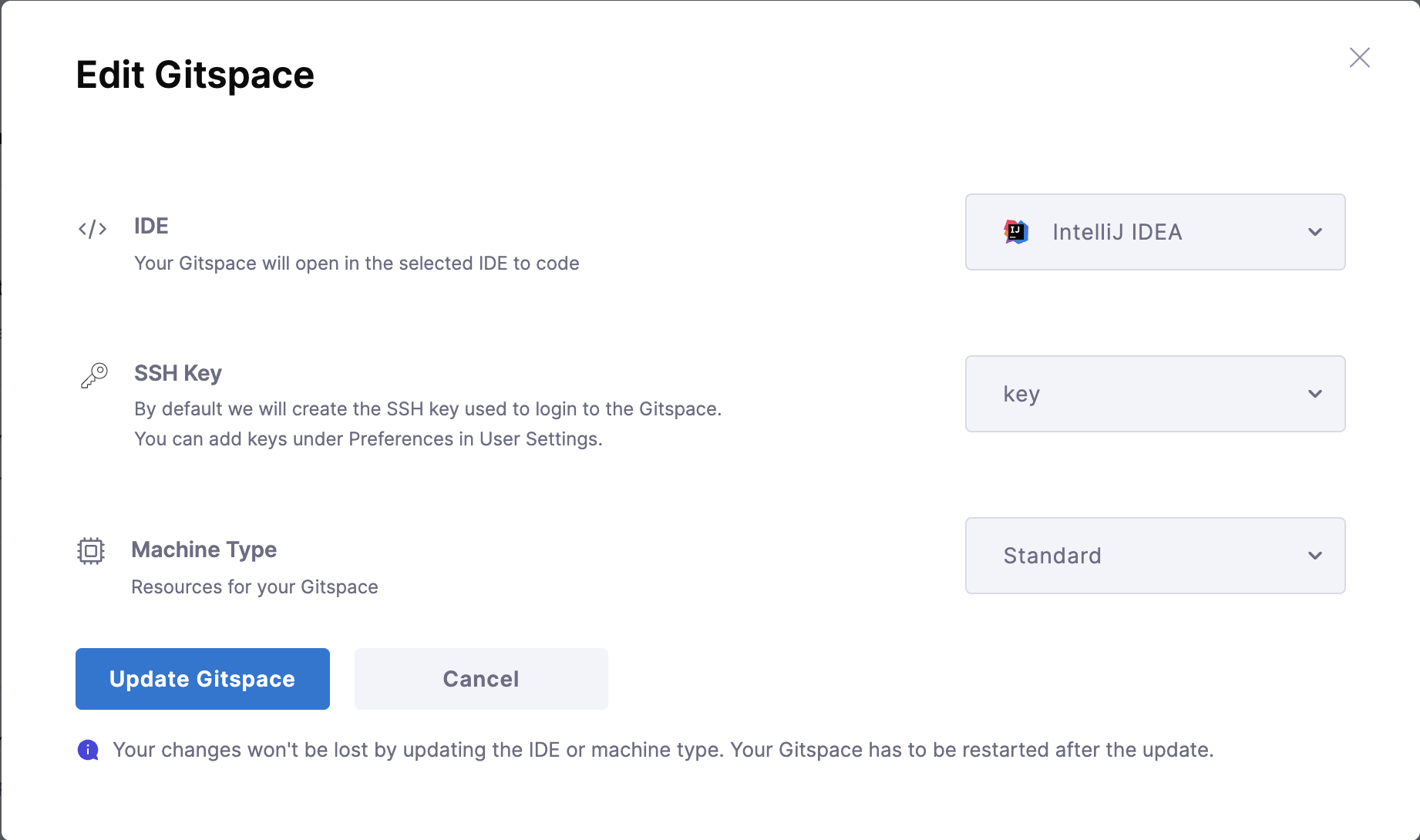 - SSH Key: You can update the SSH key of your Gitspace to a new key. This allows you to change and update the remote access credentials to your Gitspace accordingly.