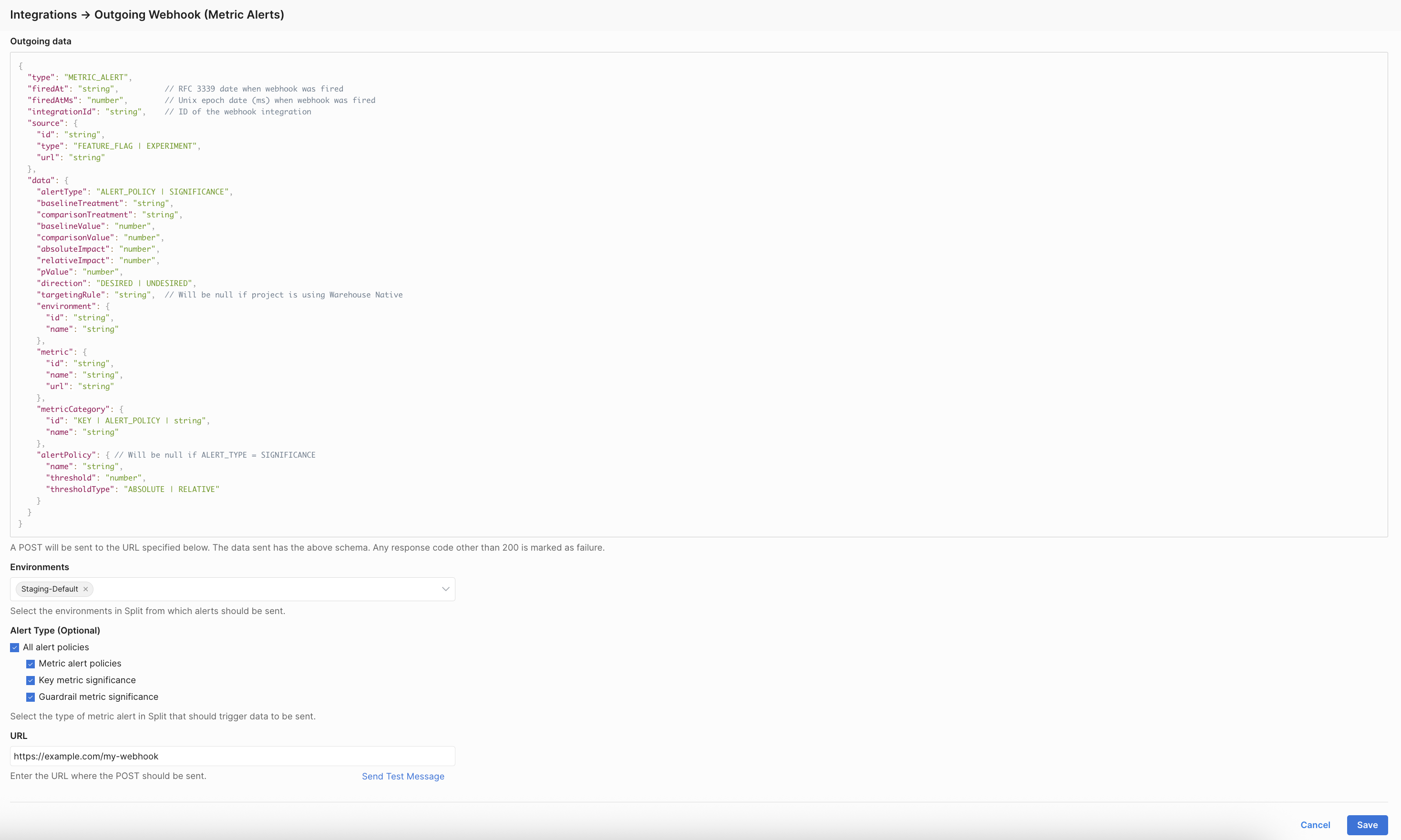 Whenever a metric alert or significance event is triggered in Harness FME, a JSON payload is sent as an HTTP POST to the configured webhook URL. You can filter alerts by environment and alert type to control which notifications are delivered.