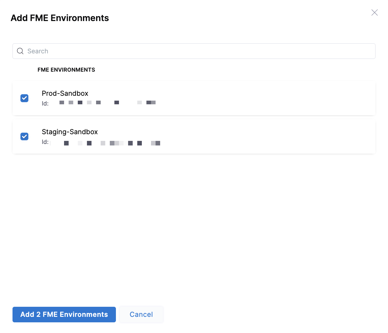 Once you've selected the environments you want to grant access for, click Add FME Environments.