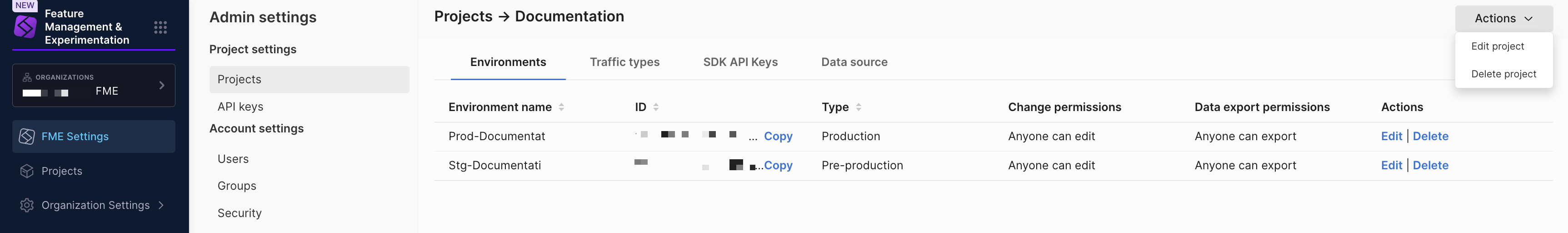 These objects include feature flags, segments, metrics, traffic types, and environments. This also allows you to determine who can see if a certain project exists.