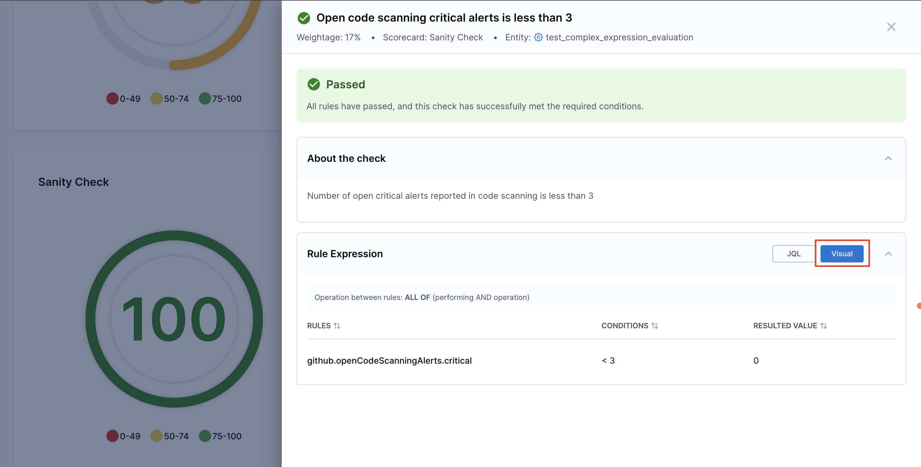 You can view detailed information about each check's execution status directly from the entity's Scorecard view. This helps you understand why a check passed or failed and take appropriate action.
