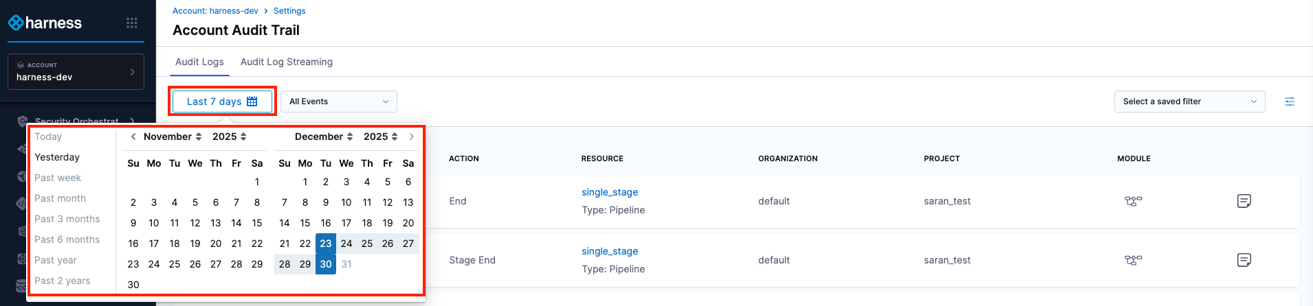 Limit the audit events displayed to a specific time range, from 1 day up to 2 years. Use the date picker to select the exact start and end dates, including the time of day.