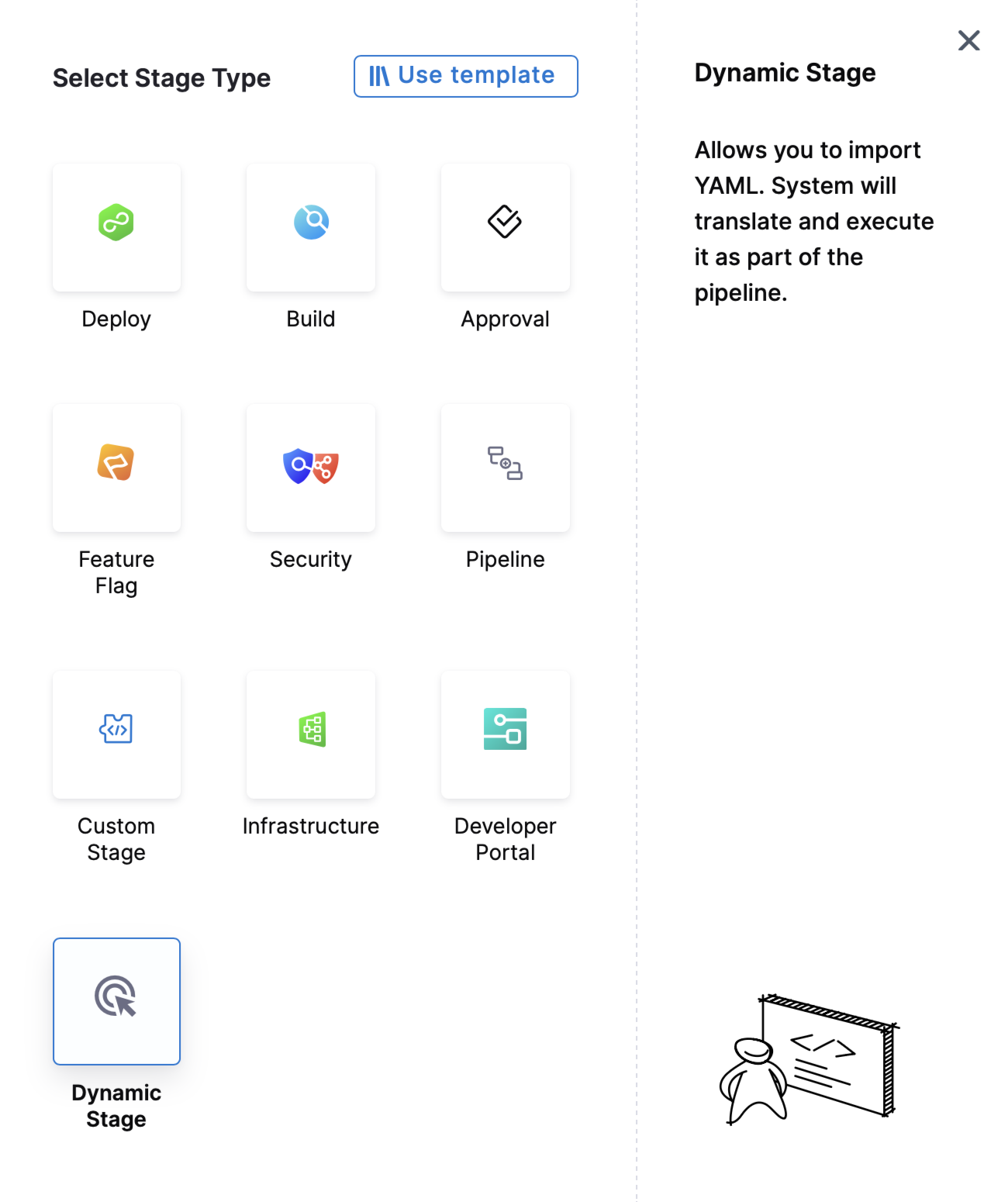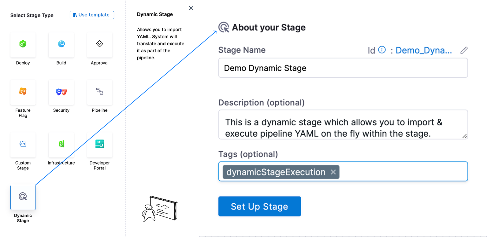 - Dynamic Stage: Dynamic Stage allows you to import pipeline YAMLs within a stage. These YAMLs can either be generated and transformed at runtime or be directly passed to the input source field of the dynamic stage in encoded form.