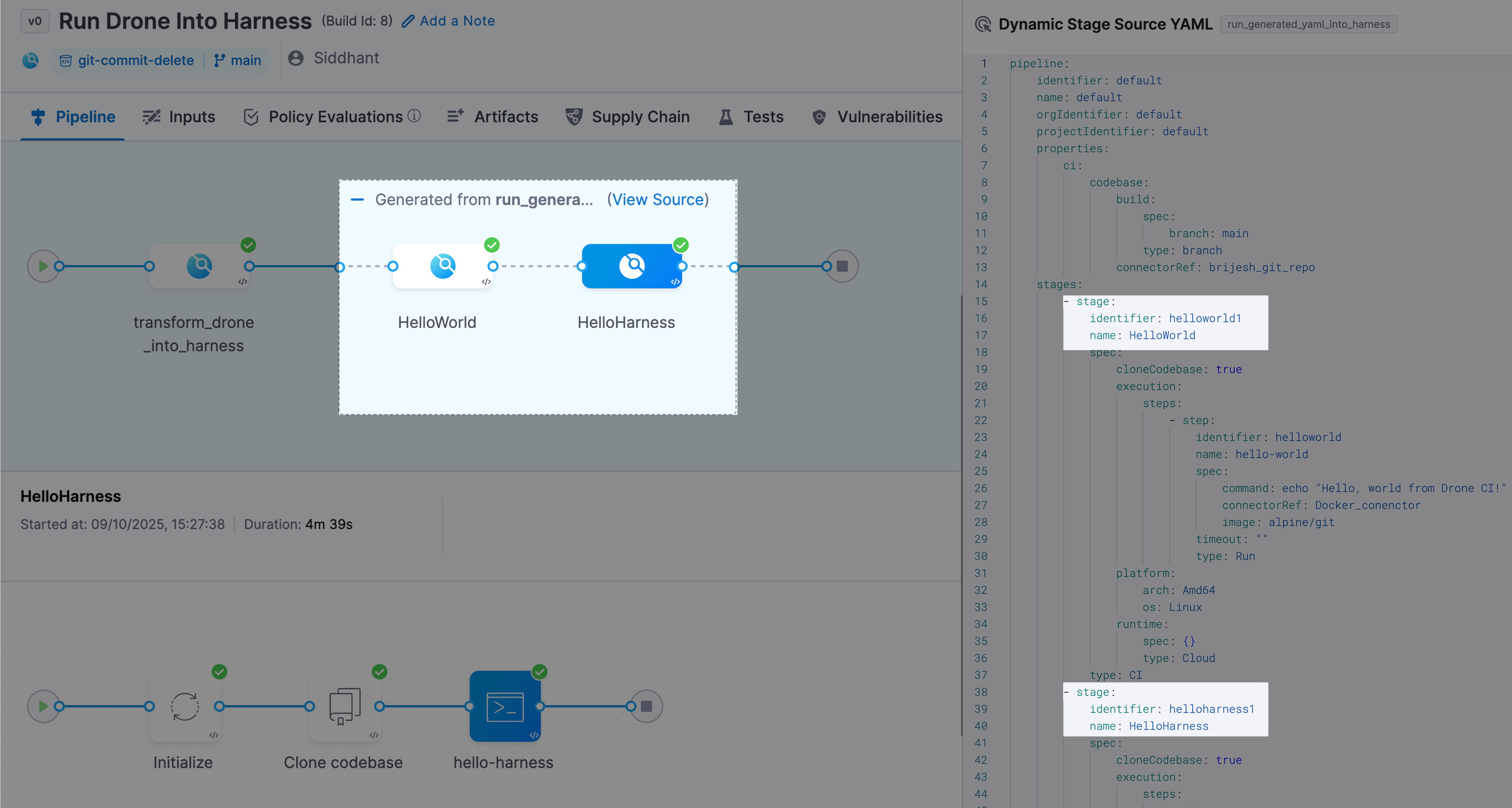 The following example demonstrates a pipeline in which a Drone pipeline is converted into a Harness pipeline through a plugin, and the encoded Harness pipeline YAML is passed to the Dynamic Stage through an expression containing the output variable belonging to the stage prior to the Dynamic Stage. This output variable stores the encoded pipeline YAML and, hence, serves as the source for the Dynamic Stage.
