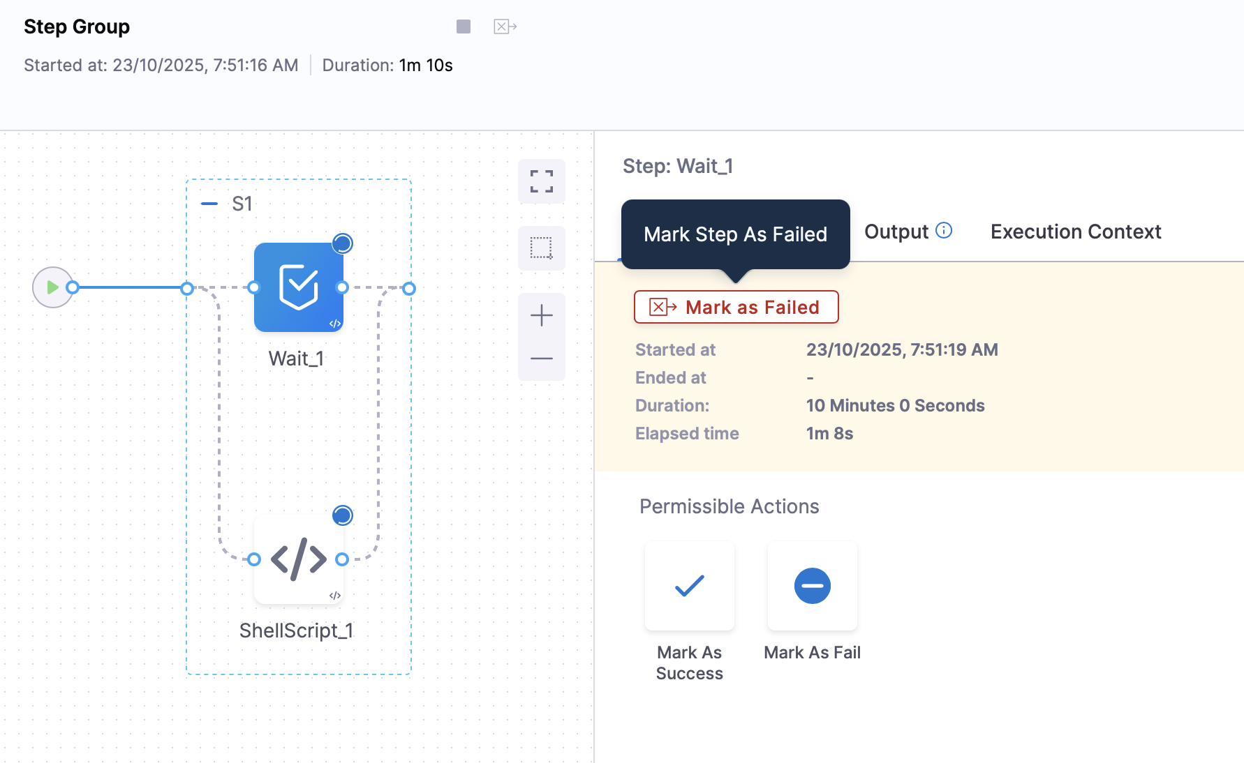 You can mark a specific step as failed during pipeline execution by selecting the step and using the Mark As Failed option.