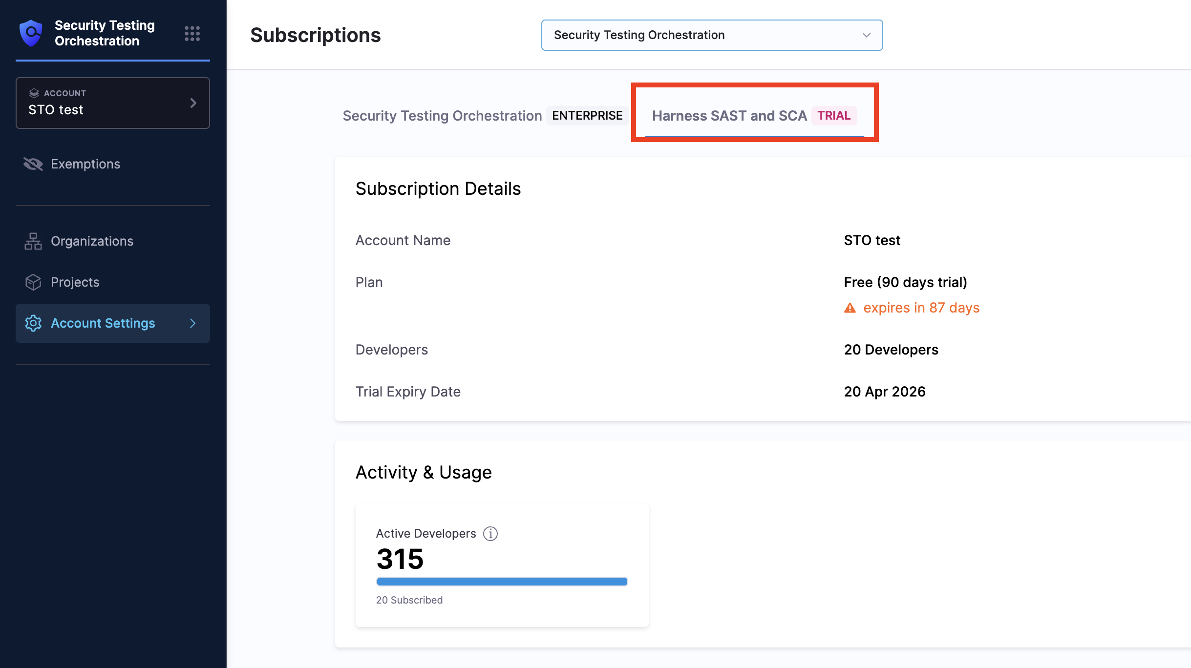 You can view your current usage and subscription details on the STO subscription page under the Harness SAST and SCA sub-tab