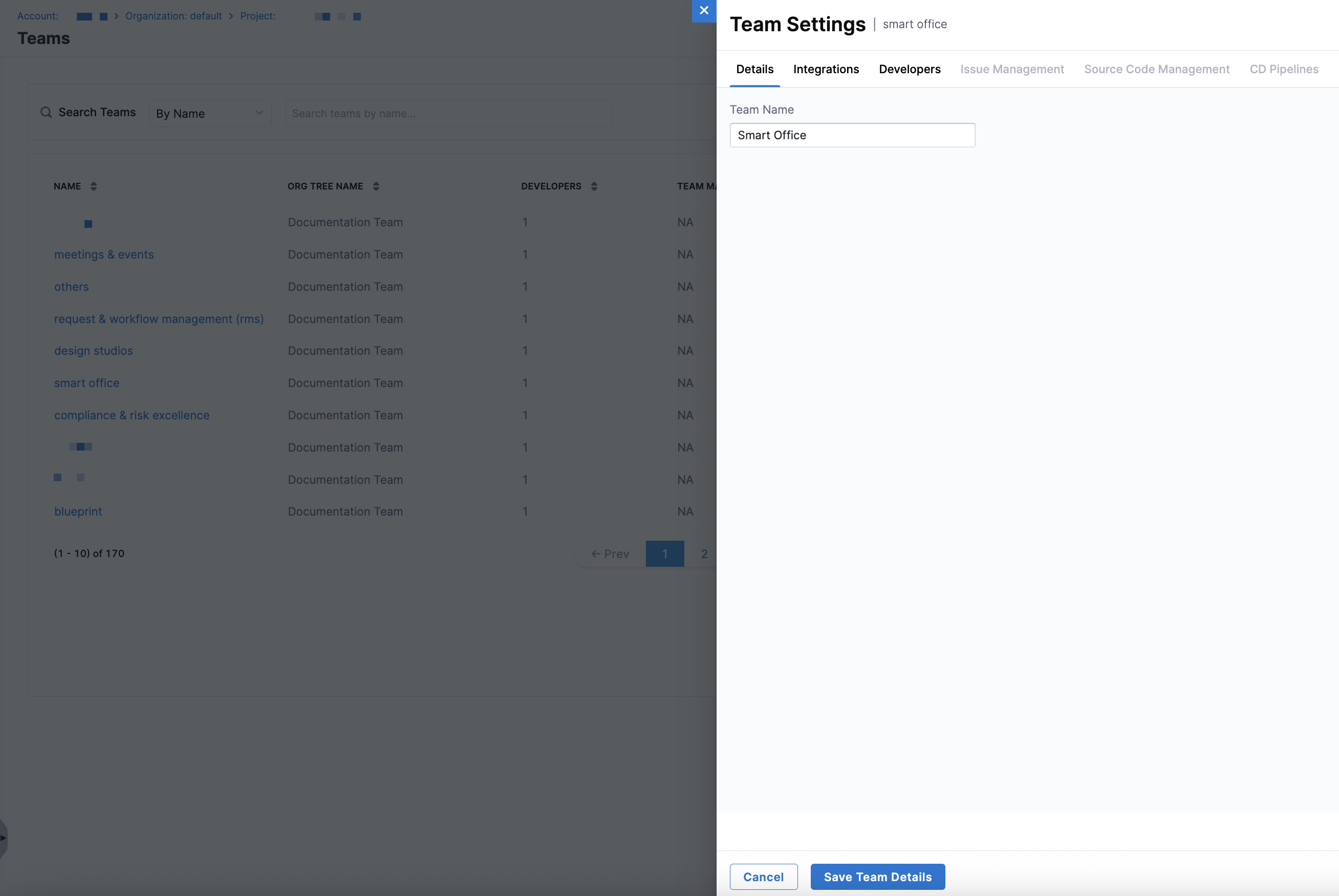 While teams are automatically derived from your organization's hierarchy, they must be configured to ensure data is attributed correctly and metrics accurately reflect how each team delivers software in SEI 2.0. To access the Team Settings side panel, click on a team in the list.