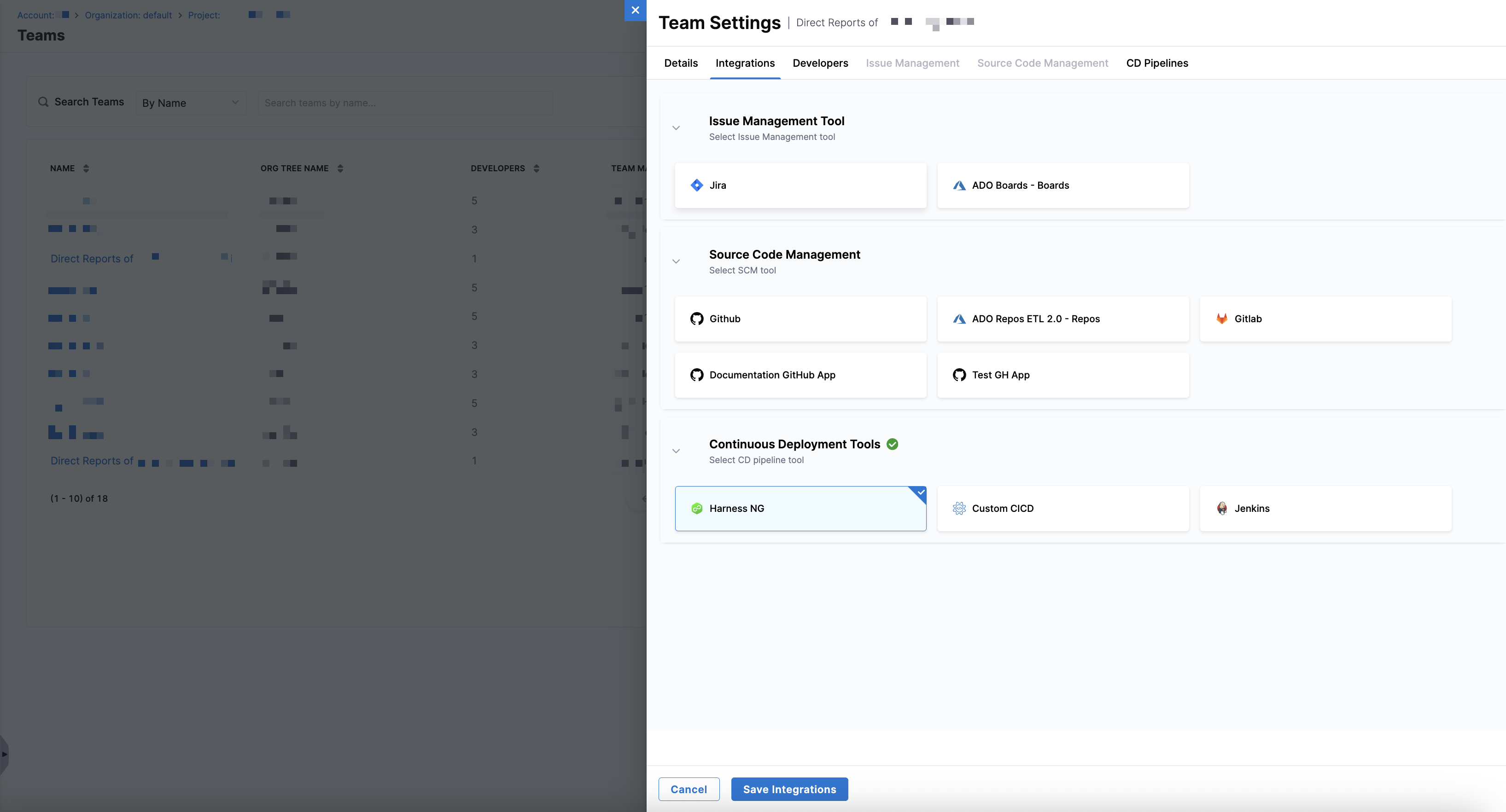 Select the tools your team uses for issue management, source code management, and continuous deployment on the Integrations tab in Team Settings. These integrations power how SEI 2.0 attributes data and calculates metrics for the team.